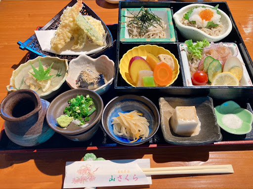 南阿蘇って蕎麦屋さん多くあるんだけどもここは料理・コスパ・雰囲気・ロケーションで総合的にナンバーワンかと思われます。 ◎場所:南阿蘇県道28号の道の駅くぎのを過ぎてえ、ここ?!って分かりにくい狭い道を曲がります。そしてそこから軽自動車でギリギリ通れる巾の道をウネウネ行くんですが、この道で正しいのかかなり不安になりながら進むため初見やと心折れると思います。だがその先に「山さくら」の小さい看板があるので進むと民家のようなお店にたどり着きます。というわけででかいワゴンやSUVで行くのはやめときましょう🚗³₃一応駐車場は店前3台くらいと第2駐車場(6台くらい)もありますが、休日にはごった返すみたいでなるはやで行くことをオススメします。 ◎店内:広い座敷にテーブルが10卓くらい。奥の窓からは阿蘇山がとどんと見える、最高のロケーション🗻 ◎メニュー:ここの名物は瓦蕎麦のようなのですが、天ぷら&蕎麦に惹かれ天ざる御膳へ。 天ぷら、蕎麦の他煮物やら小鉢が3つも付いてました。 蕎麦は地元のそば粉でのどごしの良い腰強めで良き。ツユも濃いですが飲めるくらい美味い。あとそば湯がめっちゃさらりとしててグイグイ飲める。なお蕎麦は50食限定のようなので休日はあっという間に無くなるかと。 さらに天ぷらはエビ、野菜、きの子など盛りだくさんで衣は薄めなのですがサクサクしてて、日本酒飲みたくなるレペル。あと付け塩があるのですがこれがヤバい(...