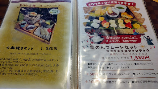 メニューは和菓子や洋菓子をミックスさせたような商品が多く、どれも食べたく迷いました。 贅沢イチゴパフェ、菓のんプレートセットのチョコソースを注文しました。 イチゴパフェわかなり贅沢でソフトクリーム、果実入りイチゴソース、粒あんと何層にも重ねられかなりの贅沢品でした プレートはマシュマロ、イチゴ、団子、ラスク粒あん添、バナナ、わらび餅、ドーナツをチョコでフォンデュします。最後にプチソフトが付きます 子供と分け合うつもりが、危ないかと思い辞めさせた餅類以外全て食べてしまうほど美味しかったようです。
