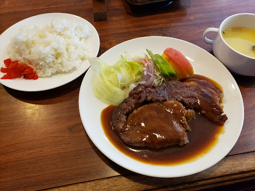 外の扉は港にありそうな雰囲気で、 中の机や内装はシックな色合いで落ち着いた感じがして好きでした。家族経営かな?接客の女将さんのテンションは高くも低くもなく。近所で働いてる息子が昼飯に寄った感じを味わえます。お客様を希望する方には合わないかもしれません。 まず、様子見でステーキセット。 サービスのお肉が端はカリッと、中はミディアムで仕上げられており、好みの調理具合でした。メニューにある最終的にはシャトーブリアンまでランクアップするステーキセットをいつか制覇してみたいと思います。 付け合わせの野菜は素材の味が楽しめます。 白ご飯に福神漬けが付いているのは、ステーキセットとしてはささやかな驚きでした。 また、メニュー制覇しにいきます。