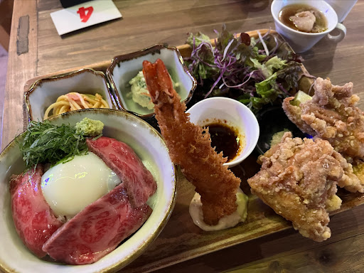 ● 和牛マグロ丼 藻塩からあげエビフライプレート …………………………………3,600円