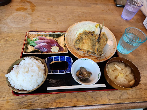 味の感想は個人的な意見です、参考までに… お刺身は多分カツオでとっても美味しかったけど、金アジフライは骨だらけで口から出すのが大変。 お任せ定食の天ぷらにもアジの天ぷらが…やっぱり骨だらけ。 フライも天ぷらも獲れたての魚のフワフワ感は感じられず、残念な感じ。 金アジならフライじゃなくて刺身の方がいいような...