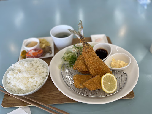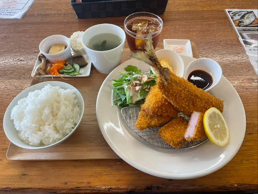 Read more平日木曜日の11時半に1人でランチ訪問 元幼稚園?だった建物にできた食堂 元の園庭には木のテーブルがいくつか置かれていて良い季節の時は外で食事したら気持ちよさそうな感じです 園庭中ほどの元教室のサッシが入り口になっていて、店内に入るとカウンターでまずは注文し空いてるテーブル席に座る ヒレカツとアジフライの定食1430円を注文 トイレに行こうと内廊下に出ると柴犬のつむぎちゃんが繋がれていて撫でるととても人懐こくて可愛い 手を洗って料理を待つこと15分料理到着 見た目はとても美味しそうで、実際に食べてみるとヒレカツは柔らかく、アジフライも新鮮でほんと美味しい!! 次回は暑く無い時に犬連れてまた来たい...