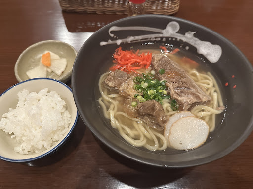 ランチメニューの沖縄そばと軟骨ソーキ丼を注文。 沖縄そばにはご飯と小鉢が付き、追加料金で白米がじゅーし(混ぜごはん)変更できます。 ソーキ丼にはパスタサラダとスープが付きました。 そばの麺は太麺でスープとしっかりあってます。ソーキは柔らかくて程よい味です。口の中で溶ける様な感じはたまりません。 量は普通か少なめです。