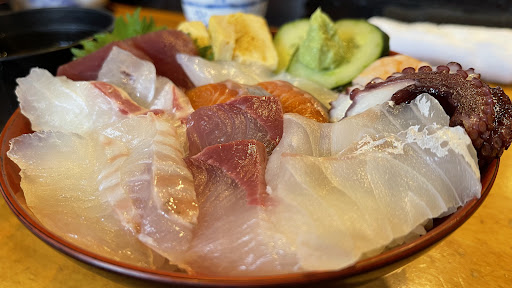 知多南方に行った時にちょうど昼時だったから寄ってみました。 クチコミでは結構混むようなイメージでしたか13時ごろ、そして緊急事態宣言下というのもあるのか、前1組と言った状況。 名前を書いて待ってる時に店内眺めてましたが、いわゆるコロナ対策はだいぶ緩い感じ。仕切り的なものは一切無し。入り口のアルコールくらいでした。まぁそこはそれ。嫌な人はそれ見て帰ればいいだけの事。私たちは待つ事に。 オペレーションもちょっと緩い感じ。 空いてる席あっても案内しない。 コロナ対策かなーと思えなくもないけど空きの席は不規則で、隣同士でも入ってるところは入ってる。 んー、謎。 案内された時、上記の調子なものだから「カウンターと、座敷どっちでもいいけどどちらがいいですか?」って聞かれました。まあ素直に「カウンターお願いします」って言ったけど、その席は入店した瞬間から空いてた席じゃんってツッコミたくなりました。 着席して、海鮮丼(ご飯大盛り)と刺身定食を注文。 提供は10分以内。早い。 出てきた海鮮丼も刺身定食も「うわーすごいー」とはならないミニな感じなシロモノ。 ま、でも食べます。 味(素材、鮮度)はまぁまぁ。身もしっかりしてるし旨味も感じられる。でもご飯とイマイチ合っていない。 メニューに「白飯」ってわざわざ書いてあったから文句は無いけどね。 ワサビも業務用の粉を溶いて使うやつ。正直イマイチ。 量が少ないから味わって噛み締めて食べましたがすぐ食べ終わりました。 このレベルの海鮮丼なら正直他でも(もっと内陸の方でも)食べられます。 これらのメニューがせめて今の4分の3くらいの価格で食べられるならアリかなー...
