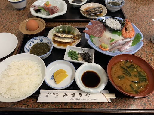 平日の昼間師崎の朝市のついでに寄りました。 梅雨時の平日の為か、ランチタイム空いていてすんなり入店出来ました。 師崎フェリー乗り場へと二股に分かれる交差点の角に店は有ります。 駐車場🅿の案内板に進むと奥にも沢山止めれます。 外の看板メニューをみると刺身定食が1200円 コスパいいかな?! 決してきれいな佇まいではない玄関から入ると右側に座敷の部屋が5席ほど野こじんまりした所で先客が一組。 メニューから海鮮丼定食、天ぷら定食を注文 しばし待ちの間、先客と店の評判を話されて美味しいと言われました。 天ぷら定食は想像通り 海鮮丼定食は皿に雲丹、サザエ、刺身盛り合わせ(マグロ、イカ、白身肴)と豪華でそのまま食べてもいいし御飯に載せて丼にしてもヨシ。 部屋の壁には多くの芸能人の色紙がありました。 口コミは低、高評価の両極端ですが★5つにします。 夫婦二人で食事処とお泊りの...
