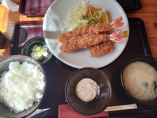 Read more外見からかなり年季が入ったお店かと想像していましたが、店内は木が主体で穏やかさを感じる良い雰囲気でした。 写真は数量限定と書かれている盛り合わせ定食です。 海老は大きいものが2本、ヒレ肉は柔らかく旨い。 揚げ物だけでなく、お味噌汁も熱々で出してくれ、ご飯もしっかりあるため満腹満足。