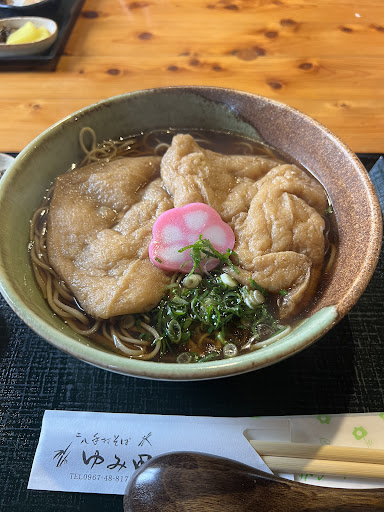スープをいただくときつねから染み出したお出汁がそばのお出汁と合わさり濃いめのお出汁になっております