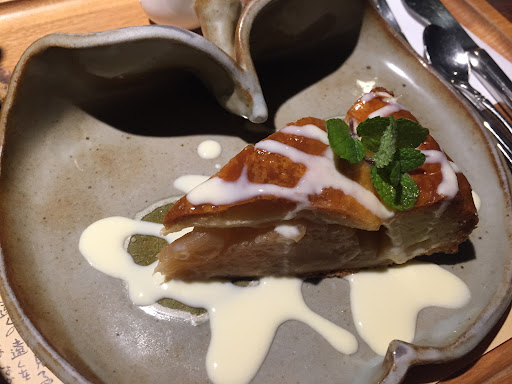 The crust was made of layers of flaky dough that did not fall apart, in fact it was all stuck together, doughy and hard. You find it hard to cut it with the side of a fork. Were they trying to make a flaky pie crust or a soft bread dough crust…? Regardless, they failed at both. The apple filling was in large chunks and not really held together by any sauce that gave it a sense of cohesiveness. Moreover, the size of the slice did not warrant the price.