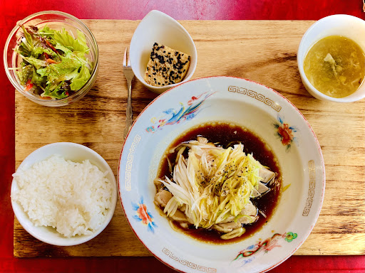 火加減抜群の蒸し鶏、香り高いネギに 醤油香醋? 深みのある甘酸っぱいタレ。 プリプリな焼売、ジューシー小籠包 手造り点心2種入り定食セット スープ、白黒胡麻カステラ付き.. 最高でした。