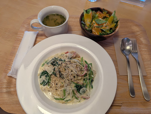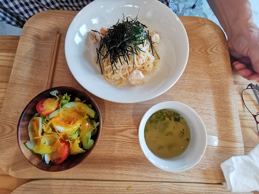 It's wonderful that Odaka station area that was shut down for many years due to the Nuclear disaster has been revived now and such fancy eateries pop up! Very stylish building and interior design, food looks beautiful too. We had seafood cod roe pasta with shrimp that was delicious. However the meat sauce pasta was lacking flavor. The menu keeps changing and when we went there it was mainly pasta, no doria. The salad was large and delicious too. Their had sweets and ice cream and such offerings for tea time too Prices are affordable and you can also buy books in Japanese from their bookstore. The restaurant was apparently created by a famous Japanese writer and she moved to this area recently. So the books that are sold in the store are chosen by her. All in all it is very refreshing to have such a modern Tokyo Omotesando style experience in this area that was shut down for...