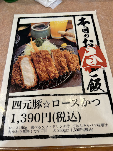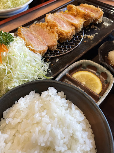 Read more何年かぶりにランチで伺いました。11時ジャストくらいに行ったのですが駐車場が満車になりかけてたので提供に時間がかかるんだろうなぁと思っていたら注文から10分もたたないで揚げたてが配膳されたのでビックリしました。 うちの奥様がランチオススメのこぼれ鉄火丼定食で私が厚切りヒレカツ定食を頼みました。 どちらもボリューム満点でとにかくお肉が柔らかく衣がサクサクでメッチャ美味しいです。 すりゴマも昔はすり鉢で擦っていたのですがクルクル回すと擦れるゴマスリ器みたいなのがあって簡単に擦れました。お店にあるソースと合わせてカツにかけると絶品です。キャベツにかけても美味しくいただけますよ。 それと付け合わせのキャベツもご飯もお味噌汁もおかわり自由なのですが元々のボリュームが凄くて私はおかわりできませんでした笑笑。 奥様の鉄火丼を少し食べさせてもらったのですが赤身というよりは中トロに近かくモチッとした美味しいマグロでした。トンカツ屋さんなのに刺身もメッチャ美味しくてビックリですね! 欠点を挙げるのならばお値段がちょっとお高いのと混みすぎるぐらいでしょうか?でも混んでるって事はみんな美味しいのわかってるって事だしあの美味さならこのお値段も納得って事なのでしょうね。 お財布に余裕があったらまた行きたいです。 お値段はこぼれ鉄火丼定食¥1,980 厚切りヒレカツ定食¥1,980ですのでトンカツ食べたい時は是非行ってみて下さい。...