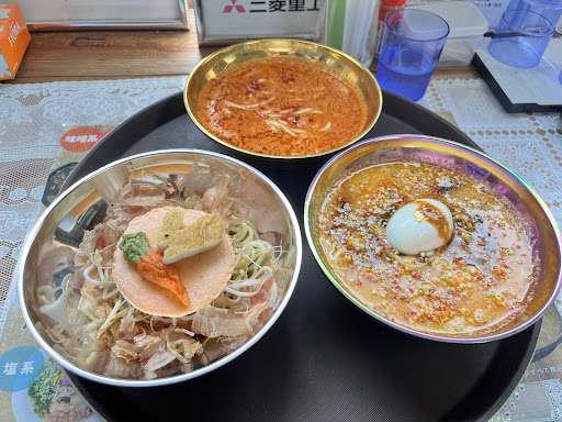 初訪問。H3ラーメン(限定8食)を頼みました。 3種類のラーメン(※一つはまぜそば)にトッピングがついてくるので、好みで振り分けられます。 結論から申し上げると、大満足でした。一見辛そうなスープも見た目よりは辛くなくエスニック風な感じでした。味は一般的なラーメンのジャンルに当てはめることができない、それこそ宇宙のように謎めいていて未知との遭遇ができた感じです。 朝食を抜いてお腹が空いた状態で食しましたが、とてもお腹いっぱいになりました。少食気味の人には1人では食べられない量です。 いつまで提供するかは未定とのことですが、正直コスパはめっちゃ良いです。1380円で高いなと思いましたが、食べたら美味しいラーメンが3種類も味わえて最高です。トッピングのチャーシューも味が...
