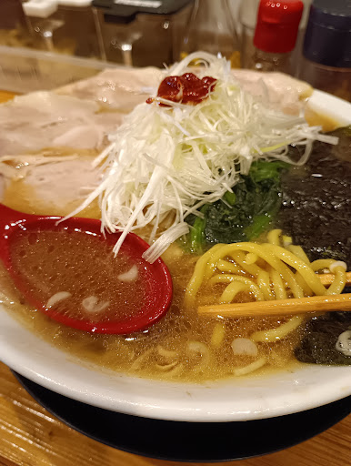 スープは熱めの少なめ、動物系からダシを抽出したコクのある醤油味。 麺はちぢれ細麺、若干低加水でパサつきのある食感。 チャーシューは豚バラ角の少々硬めの赤身部分、味染み薄切り2枚