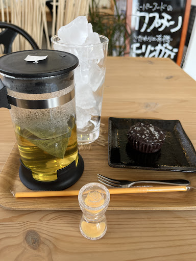 Read more涼しげなカフェでした モリンガティーなるものをアイスで頼んでみました(後ガトーショコラ) 健康に良いらしいとメニューにありましたので なんでも砂時計が落ち切ってから容器に注いでくれとの事でし...