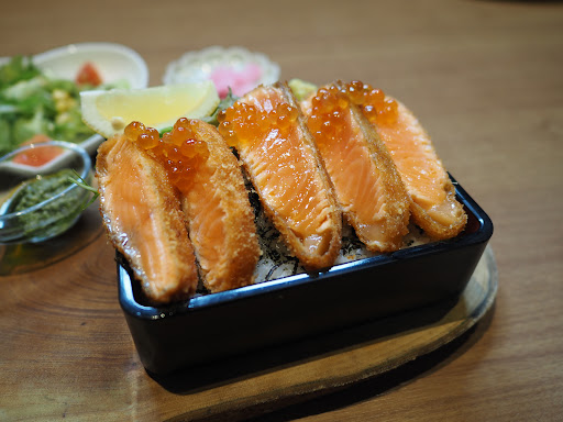 オレンジ色の見事なサーモンのレアカツのドンブリが登場です☆ 衣は薄くサクサク、サーモンは程よくレアに仕上がっています。 トンカツのような脂の重さはなく、いくらでもお腹の中に納まってしまう美味しいやつ☆