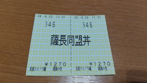 山陽道「美東サービスエリア下り」内🚙 ☆名前の通り「ご飯」主体のメニュー🍚 お昼に選んだのは『薩長同盟丼』名前に負けた😅 中身は薩摩の黒豚カツと長州の鶏カツが一つの丼の中で同盟、キャベツもたっぷり入って美味しかったです😁 他にも「晋作かつ丼」や「奇兵隊弁当」に「幕末かつカレー」などなど、維新に関連するネーミング、流石の長州は山口県、メニュー見ていて楽しかった😁
