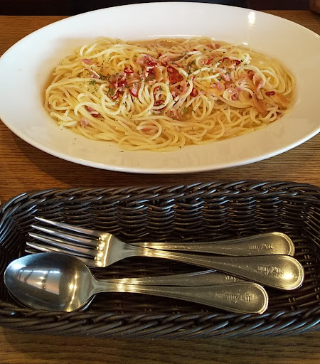 Read more2024年4月のGW前になって、TVCMで、しきりに「生パスタ」を言うのが流されて、何時も行く小野原の新しい街の🛒関西スーパーの向かいにあるこの店舗の看板を思い出したわけです😅 目には入っていたものの「鎌倉パスタ」というブランド名は、私の食指を動かすことはありませんでした。 というのも私は、🇮🇹イタリアンを標榜するお店の🍝スパゲティにまつわる「アルデンテ神話」を信じて無いです。 「どうせ、乾麺の半端な湯戻しの硬いのが出るんだろう」と思っていたからなのです。😅 もともとはパスタも「手打ち麺」であったわけで、家では約四十年前から、🇮🇹イタリア製のパスタマシンで手打ち麺を打っているのです。生麺には湯戻しの不十分な「アルデンテ」なんて存在しません。硬めでも芯なんてできっこ無いのです。だから、スパゲティを食べてから、胃の中の「硬いもの」を感じずに済みます。(本来は少し芯の残るくらいの茹で麺にフライパンなどで調理した具に茹で汁を加えて作ったソースを吸わせて柔らかくするものです。) というわけで「生麺パスタ」をCMで売り出している「カルボナーラ」で食べにきました。 ○店内入口を入って😯驚きました。そこは「脱靴場」だったのです。(入る前に、表示しとけヨ。そしたら入店してなかった😓) ウオーキングを小一時間してきたので、熱を持った汗で蒸れた足を出すのには、大きな抵抗感がありました。また、入口の段差にも抵抗がありました。足の弱くなった後期高齢者の母を連れては来れ無いと思いました。 入口土間から一段上がり、壁に取り付けられた下足箱を見るとほとんどが下足札の無い状態でした。やっと見つけた札が刺さった箱の扉を開けて、続いて段を上がった妻の靴と共に入れました。 店内レジのところにホール係が姿を見せ、私たちに気がつくと「2名様ですか?」と声をかけてくれました。ついて店内ホールに入ると「掘りごたつとテーブルのどちらがよろしいですか?」と尋ねられました。見ると明るい窓側には床を掘り下げたコタツのような卓の席が列んでいました。けれど、奥まったところにあるテーブル席を選びました。 案内されて、椅子に座ると注文を訊かれました。それで2人共に「厚切りベーコンのカルボナーラ」を注文しました。 2つのカルボナーラの皿は別々に運ばれてきました。最初の皿は約3分後、もう1つはその2分後でした。提供が早い。皿をテーブルに置く際には「熱いですからご注意下さい」と言い添えてくれました。 🥚卵黄が乗ったスパゲティをすぐに混ぜて全体に馴染ませるとほどよく食べることができました。 (ランチメニューもあるようなので、今度はそ...
