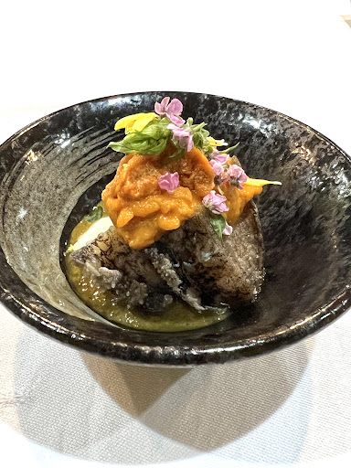 お食事は、見た目でも楽しめるような彩り豊かなお料理で、今回の食材はホワイトアスパラガス・じゃがいも・あわび・ホタテ・ウニ・マグロ・いくら・鯛・鱧・イチボのお肉等が使われていました。 ソースもいろんな味がして、おいしくいただき、お料理に関しては大変満足でした(#^^#)