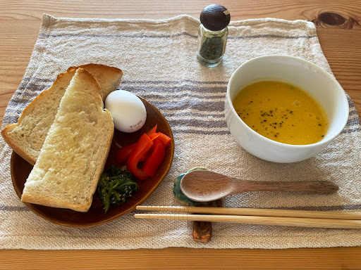 朝8:00から和洋のモーニングが食べられます。土日限定開店ですが開店日はInstagramを確認してお出かけください。店主は名古屋からIターンされた方で、SNSを見ると宿泊施設やいろんなイベントも企画して忙しそうです。お店は民家の中の一軒、車は玄関先と建物の南側に2台ほど駐車可。入り口は普通の古民家の玄関で靴を脱いで上がります。厨房はキッチン、ホールはダイニングを改装、窓からは南アルプスが見えます。古民家なので朝は寒い日もあり、スープや味噌汁はすぐ冷めてしまうのが残念でした。 パンは箕輪町ハルハナ堂のパンで朝届けてもらってるそうです。和食のおにぎりは2個で具が異なります。ドリンクはノンカフェインのもあり食後に提供されます。常連さんも多く来店されるようで、その中で飲食しないといけないのは少し、気後れする感はありますが、ほわんとした雰囲気のオーナーとお話をするのは癒しの時...