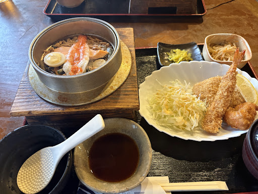 釜飯は直火炊飯ではなく水蒸気炊飯でした。その為お焦げは出来ないです。少し残念。味は濃いめです。味薄目とかも出来るそうです。釜飯自体は普通に美味しいですが、特製に入っていた山菜の水煮がどこにでも売ってる水煮で食感が自分は嫌いだったので、あれはなくてもよかったかも💦 その他の具材はそこそこおいしかった。フライセットの唐揚げは冷凍だが、カツがヒレカツだったところで驚き!!ソースが少ししょっぱいですね。