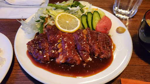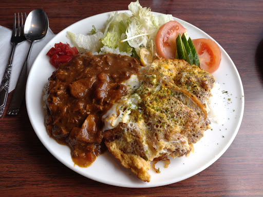 訪れようと調べていた店が定休日だった為に目的地を此方に変更しました。 店の外観が古く小さな喫茶店で良い意味で昭和の雰囲気です。 駐車場は店の裏側に4台から5台程度。店の駐車場である事を示す看板が有ります。 入店すると店内は小上りが4名程度で2卓にテーブル席が4名掛け1卓に2名掛け1卓、カウンター四人分ですが此方は、見ていると極力案内はしない様でした。 壁には来店された事が有るのか何故かシンガーソングライターのさとう宗幸さんと御主人奥様の一緒に写っている写真が。 フォークギター等も飾られて居たのでもしかしたら何か関係が有るのかもしれませんね。 店内は小上り1卓予約になっていて他の2卓も既に客が入り2名掛けテーブル席に滑り込みセーフ。 注文は俺が特製カツカレー1050円と嫁さんがコンビネーションナポリタン1100円を注文しました。 特製カツカレーは半分カレーに半分カツ丼なので正確にはカツ丼カレーです。 嫁さんの方は言ったらナポリタンメインのワンプレートランチでフライドポテトにコロッケとフライドチキンが添えられています。 注文から提供される迄の時間は混んでいた事も影響してか、言ってしまえば激遅。 少なくとも40分はかかってしまっていました。 ・・・が、奥様が本当に申し訳無さそうに、ゴメンナサイねゴメンナサイね~と忙しくパタパタパタパタ一所懸命走り回ってるの見たら『いや全然大丈夫ですから』って言っちゃいますよね。 その後予約客も訪れ店内カウンター以外は満席。 その後も客足は3組程度来店するも都度奥様が提供時間が相当かかって迷惑かけてしまうからと申し訳無さそうに御断りされていました。 店の人気がウカがえるのと、奥様の相当な人柄の良さが感じられ過ぎて好印象しか有りませんでした。 実際に運ばれて来た料理の第一印象はボリュームバツグン。 食べる前からお腹一杯は約束されました。 カレーもカツ丼も看板メニューになるだけの事はあるし、まず見た目が面白いですよね。 ナポリタンも味見させて貰いましたが、丁度良い酸味で後味も良くてトテモ美味しいナポリタンだと思いました。 ナポリタンは男性的にはドウしても量的に物足りないイメージが強くなる料理ですが、コロッケやチキンが付いてくるので間違い無く男性でもお腹一杯にはなると思います。 お店自体が小さく自分達の座ったテーブル席が多少キシミガチだったり小さな気になった点は有りつつも、料理の味は勿論の事、なんと言っても奥様の一生懸命な接客が好印象での☆5つです。 込み具合で提供される早さも変わるとは思いますが、混み合っている様な時は多少待つ...