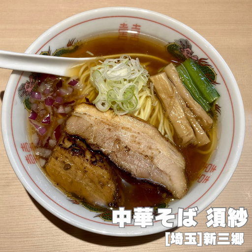 中華そば 須紗 @埼玉県三郷市彦成3丁目121-4 どうも、さぴおです ______________ 🟦動物と魚介がほっこり広がり、どこか懐かしさがありながら洗練された醤油ラーメン!  ̄ ̄ ̄ ̄ ̄ ̄ ̄ ̄ ̄ ̄ ̄ ̄ ̄ ̄ [点数] 84点 ☆3.9 [アクセス] 『新三郷駅』(1.4km) [注文メニュー] 中華そば(850円)+角煮(200円) [並び・システム] 並びなし・チケット制 [食材] 動物出汁、魚介出汁、香味出汁、豚チャーシュー、角煮、小松菜、メンマ、ネギ、紫玉ねぎ、中華麺。 [味] 醤油、やや懐かしい