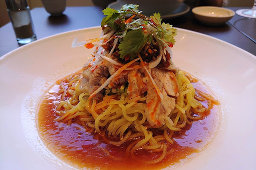 2022.05.04 ガクト的に世界一うまいと言っていた小籠包が気になり訪店。GWのせいか17時ぐらいの時間でも入るのに15分ほど待った。 【京鼎樓3種盛り】1230円 ガクトでハードルを上げすぎた…。ふわっとやわらかい生地に汁がたっぷり。提供間違いがあったりしたせいか、汁は少し冷めており、火傷するほどではなく軽くぬるいぐらいのもの。食べやすいぐらいといえば食べやすいぐらい。ぬるいせいかスープの旨味は感じられない。食べ方は黒酢につけて生姜の細切りをのせて食べるという本格派。 「京鼎小籠包」シンプルに豚の旨味を感じられる仕様、生姜などの強い味は特段感じられず、豚の旨味のみ。生姜は合うが、豚自体の風味に臭みがほぼ感じられないので、生姜なしかつ黒酢なしで食べるぐらいで豚自体を味わえる気がする。逆に豚の香りが繊細というか少し弱めなので生姜や黒酢が豚の風味を消している気がする。調理失敗か配膳失敗かショッピングモール支店だからか、世界一という感じは全くしない。 「烏龍小籠包」こちらなかなか面白かった。食べた瞬間よもぎ団子を思わせる青々しい香りが鼻を抜けて心地いい。相当いいウーロン茶を使っていると思われ、香り高く、紅茶を思わせるフレーバーは中の肉とのバランスよく、新しい体験。 「蟹肉小籠包」繊細な上記2つに変わって急にバリッと濃厚な味わい。ドカンと蟹味噌の旨味が感じられ、かに味噌好きにはたまらない一品となっている。逆に魚介風味が嫌いな友人はだめだったっぽい。そんぐらい強い蟹。これは味が強いため、臭み消しにしょうが、からし、ネギなどなどいろいろあるともっといい味になりそうな感じ。 「黒酢」これが色々謎。こちらのお店のオリジナルと思われるが、どう味わってもウスターソース。ウスターソースではないのだろうけど、限りなくウスターソースっぽくなった黒酢という印象。小籠包につけて食べたが、プラスになったのかよくわからなかった。大きくマイナスになった気もしないが、そのまま舐めると何度なめてもウスターソース。結論としては、よく分からない。わりとこういうのがスタンダードなのだろうか? 【ザーサイ肉まん】800円 文字通りザーサイの入った肉まん。生地はふかふかで、しっかり美味しい感があり、ザーサイも食感など面白いところではあるが、普通に美味しいのでザーサイ無し肉まんも食べてみたかった。ザーサイが大きくプラスになった気はしない。ややマイナスなくらいの印象。 【春巻き】800円 たけのこの風味が効いている一品。それに謎の甘い芋のようなでんぷん質の餡が特徴的。付属のからしが風味が強くて美味しい。 【油淋鶏】1180円 パリッとした衣に甘酢あん大量のネギが得量的。ネギは辛味抜きしているようで、辛さは少なくネギの風味だけが感じられるようになっている。味として大きな特徴は感じなかったが、スタンダードに美味しい。 【中国漬菜入り角煮 蒸しパン添え】1430円 正直肉の旨味が少し弱い印象。ふわっと八角を感じる。何気にパンが甘くて美味しく、はさんで食べたとき肉の旨味が引き立った。 【麻婆豆腐】1230円 結構珍しいホアジャオに頼らない麻婆。いい感じに辛いのだが、唐辛子系の辛味で、ホアジャオの痺れは全く感じない。コクもあり、なかなか美味しいのではあるが、八角が奥の方に感じ、コショーだろうかスパイスが効かせており所々カレーがよぎる。カレーと麻婆の中間という感じ。やはりホアジャオの風味は多少なりとほしい。 【鶏ささみ餃子】680円 小さめな餃子。揚餃子風で皮はパリパリ。鶏ささみのせいか味は弱い。餃子として普通に一枚落ちる。チェーン店居酒屋でも提供できるレベル。 【担担麺】1180円 これなかなか良かった。胡麻の香りが芳醇に香り、全力でごまを感じられる。ごま自体を乾煎りとかしてそうなぐらい強い香り。それを味噌ベースのタレがしっかり受け止め、担担麺としてなかなか。全体的に八角押し風味の店だが、こちらはあまり感じない。麺は悪くもなくぐらいの王道中華ストレート麺。これは頼んでも大きく損はない。 【海老入りXO醤チャーハン】1430円 これは正直失敗だった。油でしっとりしたチャーハンはエビチャーハンというよりチリメンジャコチャーハンだった。一口二口はそれなりに美味しいのだが、だんだんチリメンジャコの強い風味が邪魔になり飽きる。味の広がりがなく、海老と卵の風味を感じづらい。普通のチャーハンにしたほうが良さそう。百円ほどで大盛りにできる。 【台湾黒酢の酢豚】1280円 これは悪くはない。揚げた豚にさつまいもで酢豚という組み合わせは思いの外あっていて良かった。しかし値段の割に豚自体の味が弱く、脂身の旨味が感じられない。味付けは黒酢の風味は悪くないが、それ以外味付けに工夫は感じられない。 【魯肉飯】950円 八角がふんわり効いた肉の丼。こちらも肉の味が弱く、丼として米が消費できない。味玉の味も弱め。可もなく不可もないぐ