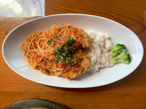 コムシロンパスタは豆腐のもろみ漬というものを使用しているからなのか独特の香り。味はとってもまろやかで美味しかったです。柚子胡椒のおかげで更に美味しく食べられました。 ちなみに成人男性にはもう一品追加したくなるかな?という量です。 そこで2品目に出てきたトルコライス。 ナポリタンとそこそこ大きなチキンカツ2つ。ボリューミー! チキンカツも熱々、中はジューシー、これだけでもとても美味しいので別メニューのチキン南蛮プレートは次は食べてみたいと期待が高まりました。 トルコライスほんと美味しい。 男性満足できる量だと思います。ハバネロソースはお好みでご使用ください。間違えると辛いです。 窓際の席に通してくださったのでほどよい日差しを浴びつつランチしました。 ご馳走さまでした。 また来ます。