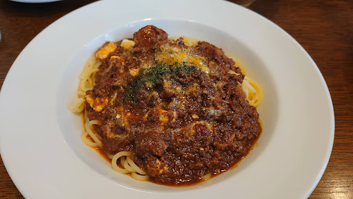 土曜日のお昼、いつも混んでいるのでオープンの11時過ぎ頃来店。待ち客は0でした。 しかし、友人が後から来る予定だったのですが、全員揃ってからでないと席に案内できないとのこと😭 仕方ないので一度帰宅し、30分後くらいに改めて伺いました。 11時40分頃ー3組くらい待ちがありましたが、思ってたよりは混んでいませんでした。(2、3時間待ちを予想(笑)) 3.40分くらいで呼ばれ、席へー 並んでる時に事前に注文をとってくれていたので比較的早く料理も運ばれてきました! 私は三郷ミートとサラダセット、友人は茄子三郷ミートと前菜サラダセットを注文。 普通のサラダも結構な大盛りでした! 友達は…でしたね(笑) 前菜サラダは普通の量じゃないです、一つの料理としてみたほうがいいかもです。 パスタはLまで無料でしたので迷いましたがMで正解でした!食べきれない💦 パスタの生麺がとてもしっかりしてるので、一本一本がずしんときます😂 ミートソースは濃い目の大人な味でした。 とても美味しかったです!! セットのドリンクも種類多かったです。