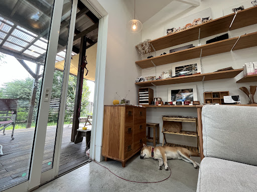 Read more多分アウトドアカフェ。 アウトドアギアが多数展示しており、デッキにはスノピの椅子やランタン、焚き火台などあり、居るだけでキャンプ感を味わえる空間。