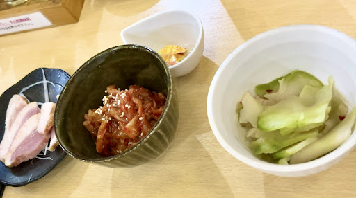 ✔︎お得な3点セット ・キムチ コクうま辛系で、酸味甘味控えめです。個人的には結構好きです。 ・ザーサイ フレッシュなザーサイで、よくあるラー油などはデフォルト装備していない、さっぱり系でした。 ・合鴨スモーク 普通です。