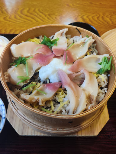 Read more土曜日の昼ごはんに訪問。こちら方面(青森県内だが三沢ではない)に長期出張で来ているが、なかなか外食が取れませんでした。 で、近くに用があって「おいしい店」(なんともおおざっぱな。。。)で検索したらこちらの店が近そう。 13時少し前に伺って、店の客は私一人。 店は前からあるのでしょう。和風の落ち着いた、かつリーズナブルという感じの雰囲気。夜、酒を酌み交わしながら落ち着いて料理を食べるという感じ。。 で、私が注文したのは「わっぱ飯」。あとで調べてみると、正確には青森ではなく南東北から越後方面の名物のようです。 わっぱ飯は月替わりのようで、2025年10月はキノコのわっぱ飯。店の方は、年配の方でした。いい感じの接客で好感を持ちました。 で、肝心のわっぱ飯。ご飯を蒸している感じだったので私は、炊き込みご飯に近いものなのかなと勝手に想像。 まあその想像は大きく外れてはいませんでした。 ただ、想像と大きく違ったのは味。醤油味がベースっぽいのですが、甘辛。しかも甘味がかなり強い。私自身の好みは、料理に砂糖の味は全然、またはあまり利いていないもの。 ちょっと好みとは合わない。ただし、その他の点はよかったので、評価を4としました。 東北方面って、私のイメージでは、塩気、塩味が中心の味付けが多いと思っていたのですが、そうとは限らないのかな?