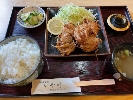 日曜日は第1、第3日曜日が休みのようです。 2023.4 空自アレンジ唐揚げ定食とバラ焼き(すき焼き風)セットを頂きました。唐揚げの方はカレー粉、醬油ダレ(?)、食べるラー油ぽいもの(?)と3つの味が楽しめます。中でもカレー粉が特に美味しかったです。 バラ焼きは生卵がついてくるのですき焼きのように絡めて食べる事が出来2度美味しいです。良い牛肉を使ってるのか、あまり食べた事はありませんが今まで食べたバラ焼きの中では間違いなく1番美味しかったです。別メニューの和牛のしゃぶしゃぶはA4ランクの牛肉らしいのですがもしかして同じ肉? そして味噌汁も美味しかったです。 駐車場は詳しく分かりませんが店の前数台の他、隣の隣のパン屋さん?の隣の空き地にもとめてよいそうです。席はたぶん座敷が4つとテーブル席1、昼過ぎで空いてたので一人でも気軽に利用できました。 2023.4 追記 漬け丼(白身魚)をいただきました。何の魚か分かりません(普段魚は食べないので💦) でしたが、濃いめのちょっと個性ある味付けで凄く美味しかったです。県内の有名処の漬け丼よりも美味しかったです。 2023.10追記 ...