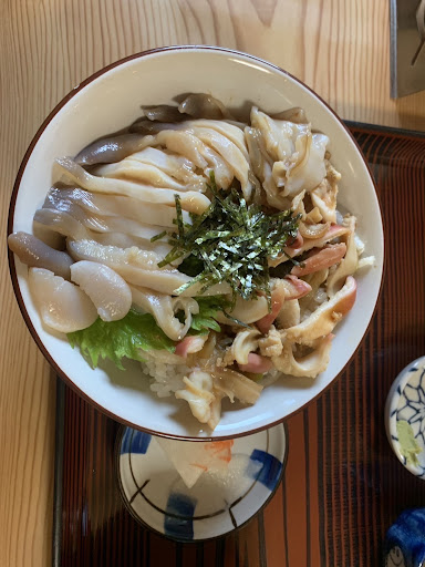 季節限定のホッキ丼 生の刺身と、茹でたほっきの2食丼。 こりこり食感がたまらないおいしさ。三沢駅目の前なのでアクセスもよく、昼過ぎでしたが地元の方たちで賑わっていました。