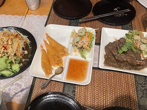 Appetizers: We ordered nearly every appetizer on the menu, except one. Each dish was delicious! I was unable to eat the papaya salad, as my coworker ordered it with a low spice level that was too intense for me. However, we absolutely loved the pork rib appetizer, which came in a flavorful pepper sauce reminiscent of gravy. Its richness made it so good that I could easily have it as an entrée with rice.