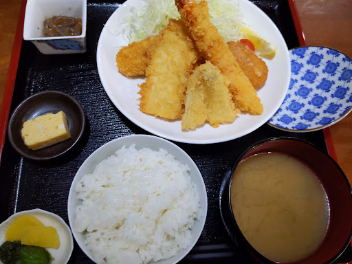 Read more三島市にある昼は定食屋、夜は居酒屋になる人気店です。 ランチが凄く魅力的でビックリしました。 唐揚げとかミックスフライとか刺身とか天ぷらの定食が安価で大量にあります。 しかも、ご飯お替り無料です。 当方はミックスフライ定食で、連れは刺身定食売切れで天ぷら定食にしました。 天ぷらはシシトウを貰いましたが、絶妙な衣で美味しかったです。 野菜の天ぷらが山程ある豪華な定食です。 ミックスフライ定食ですが、沢山のフライが入っていました。 海老・イカ・キス・クリームコロッケ・ヒレカツ・チキンカツがありました。 こちらのフライも揚げ方が上手く、これだけ食べても胃もたれしません。 美味しくて量があって、更に安いと三拍子揃った名店でした。 品切れだった刺身定食も沢山魚が合って美味しそうです。 人気店なので、並ぶのは覚悟してください。 駐車場は店内北側にある場所の、...