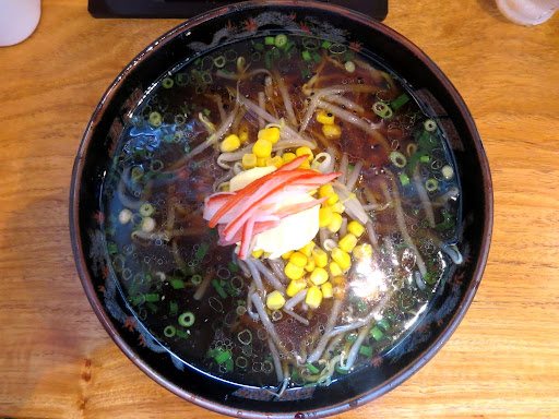 具はもやし、コーン、バター、カニカマ、ネギ。チャーシューの類は乗らない。またいつもの味玉はメニューにない。 後半になってバターを溶かし込むも表層のラードがあるのであまり良い感じにはならない。 また、生姜の風味にスポイルされているのか、バター特有の香りもあまり感じられない。 具材に関しては特筆する部分は少ない。