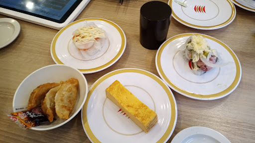 This conveyor belt sushi chain is slightly different than the others, it does not have sushi just traveling around on the conveyor belt. This restaurant does not have any other language on their menu other than Japanese, but there are pictures. Once you place your order the places stop at your table, you pick up the plate and must hit the button on the tablet saying you have accepted the plate. Almost everything on the menu is ¥100. There is a drink bar for ¥200, if you do that enjoy the free water or green tea. The staff was friendly and helpful if you needed them. Great place for an inexpensive lunch or dinner for the family. You can only order four pieces of sushi at a time or four individual items which can be somewhat of a hassle. There is bento boxes of you decide to take something to go. I would give 3.5...