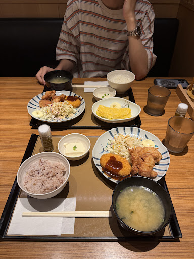 から揚げ&コロッケ定食(税込890円)を頼み、お米は白米からもち麦ごはんに変更をしました🍚🥢