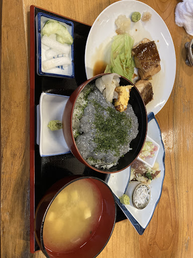 Read more刺身定食を注文しました。 自分の地元も魚の町なのでどうしても比較しますが、地元なら1500円くらいしそうな刺盛りが1000円で種類豊富で味も新鮮。しかも豪華でした。 しらすは自分の地元のが断然美味でした。 来店時他にお客さんがいなかったのですが、食事が出るまでに30分くらいかかりました。 GW中の日曜18時すぎです。 刺盛りに時間がかかるのかな?たまたまかな? 水槽に魚が泳いでいたのでさばくところからだから? 店員さんの人柄も良かったので、時間に厳しくない方なら...