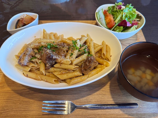 茨大入口付近にある食堂です。パスタランチと日替りランチ、専門店⁉️ちょと古い建物の2階にあるお店です。正直言ってメニューは少ないけどメインは勿論だけど手作り小鉢が大変美味しい‼️のが2つ‼️ご飯も小〜てんこ盛りまであり勿論無料でありがいいシステムだ。 やはり学生さんが多いので優しいサービスで一般人も無料ですが学生に対して支援金を募集しているのかな❓一口二百円から(細部不明)? ま〰︎強制では無いので気にしないて下さい‼️ 料理も丁寧で今回は揚げたての唐揚げ定食を頂きましたがとても柔らかくて美味しかったけど少し🤏味が薄い様な気がしました。この季節だから塩分が不足しているのかな?と考えつつ食べましたが満足な量と味でした。特に小鉢は手作りでとても美味しいかった。 近くに駐車場がないので◯◯の店舗のところに駐車してお邪魔しました。値段も安価で満足できる味...