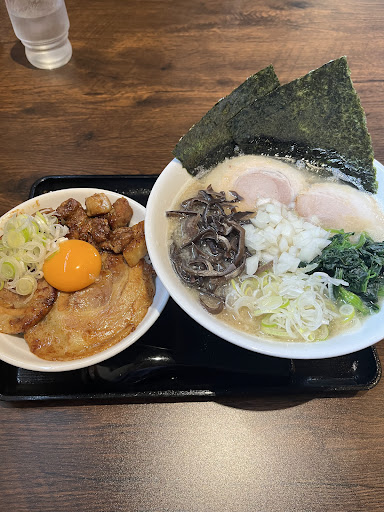 鶏ガラ+とんこつでお願いしました 待つ事数分で配膳され、早速スープからいただくと予想よりあっさりめでどちらかといえばとんこつよりも塩ラーメンの風味に近い感じでしょうか 中細麺なので醤油の方が合うかもしれませんね チャーシュー丼は肉の厚みもあり白米が進む甘めの味付けで大満足な量 卓上の調味料も豊富で高菜は辛味があり、味変も楽しめます