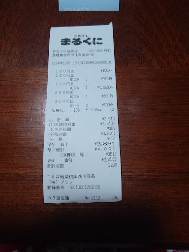 Read more「ネタが小さくなってしまいました」 数年前に1度訪問したことがあります。その時は「ネタがでっかいらしい」という噂があったので・・・確かにその当時は大きかったですね。で今回はどうかというと「普通」でした。特徴らしいモノは見当たりません。むしろ「本日のおすすめ」とか「本日のサービス」などもどこにも見当たらず。目の前を通り過ぎていく寿司やスイーツを手に取るか、板前さんにオーダーするかしかありませんでした。 この日は土曜日で店内は10組以上待ちがありましたが、妻と二人だったのでカウンター席はスグに空いたので待ち時間は5分程度でした。家族連れ行く方はボックス席を希望されることが多いと思いますので、その時は待つことを覚悟しなくてはなりませんね。 妻が「みそ汁」を頼んだのですがあまりに普通だったので(期待が大きすぎた)がっかりしていました。感動すると必ず写真も撮るのですが今回はそんな状態でしたので結局1枚もありません。 空腹を満たすためだけに選んでいるのでは無く、そこには期待と感動があってほしいと思います。まるくにさん、頑張ってください!!