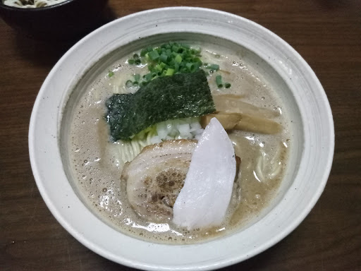 Read more麺9点 800円 汁10点 具10点 総合10点 文句なしの名店!水戸でも一番の人気店ぽい感じだったが、まさかこんなにハイクオリティとは思わなかった! 写真見てま~うまいだろうなとおもってはいたが、やはりうまいスープ。見た目は臭みも強いかと思いきや、まさかのクセが少ないスーパーくりーみーど濃厚スープ!魚介に、内臓ぽさは全くない、そこにポタージュスープを思い出すクリーミーさが絶妙なバランスで作られている。これに玉ねぎがまた良く合う。それに小ネギも合わせると涙がでる一口に! 麺もそれにしっかり合う素晴らしい麺。中太ストレートの麺だったが、しっかりと濃厚なスープに合ういい麺。 チャーシューの仕様がまた素晴らしい。またまた濃厚な肉の味がドカンと口の中に広がり、強制的に笑顔になる。厚切りでなかなか大きいチャーシューなのに、もう一つ鶏?の低温熟成チャーシューもノーマルなのに付属していてこれがまた超うまい。しっとり感が半端なく、透明感のある極上のうまみがたまらない。そこに特殊な味のメンマも面白い、みたらし団子を思い出す甘めなみりん醤油という印象。これだけは新しすぎてあうのか合わないのか判断に苦しむ感じだった。 ほかにチャーシュー丼(300円)を選んでみたが、これも正解。かなりよく出来ているチャーシューをまさかのマヨネーズで出してくるとは!?そこにタレが絡み合ってメチャウマ!この大胆さがまたおもしろい。最後にスープを入れて食べてみたが文句なしに激ウマ。てゆうか、ご飯に合うスープとしては有数レベルかも。 ここで秀逸だったのが和え玉という名の替え玉。替え玉なのだが、味が付いていて、混ぜそばとして食べてもいいし、つけ麺みたいにして食べてもいいし、替え玉として食べてもいい。しかも四種類も味があって、途中からこの素晴らしいスープのほかの味を楽しめるというとってもイキな発明!これはどんどんほかの店でまねしてもらいたいもんだ!ちなみに友人の頼んだエビの和え玉は、エビ感が超強い、ちょっと強すぎるぐらいかも。次はにぼしかタンタン食べてみたい。 そんな感じで、極上ラーメンに工夫に工夫を重ねた具合がたまらない。つけ麺や混ぜそばもあるみたいなので試して...