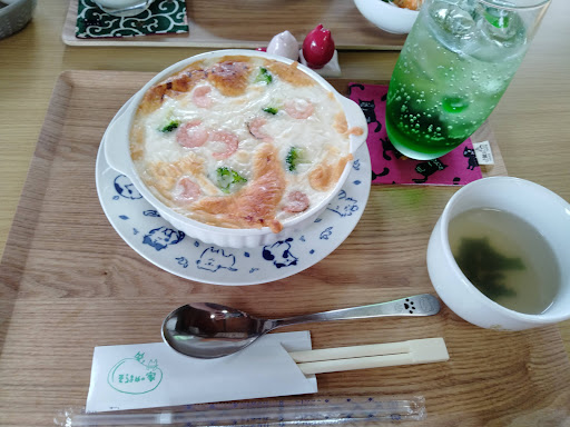 ∗)場所は初め分かりにくかったですが、大きい看板のすぐ隣にありました。お店に入ってみると、まるで実家に帰ったような落ち着いた雰囲気を味わうことが出来ました。 メニューはトマトドリア、メロンソーダそして、エビピラフ、カルピスを頼みました。飲み物は通常は400円くらいでしたが、食べるものとセットで頼むと220円だったのでお得です(❁´ω