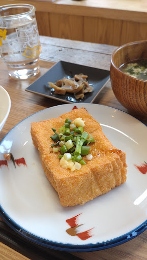 限定の麻婆豆腐定食も迷ったけれど、厚揚げを注文。 豆腐を図って値段が決まります。 ご飯、みそ汁、漬物などはセルフで用意するスタイル。