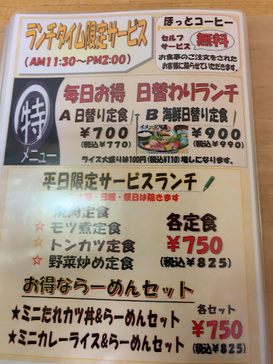 定食は800〜1000円。 300円プラスすると味噌汁→ミニラーメンへ変更可能。ミニラーメンといっても、チャーシューもついてるし少食なひとはこれで十分なくらい。2人で定食をひとつでも十分かもしれない。