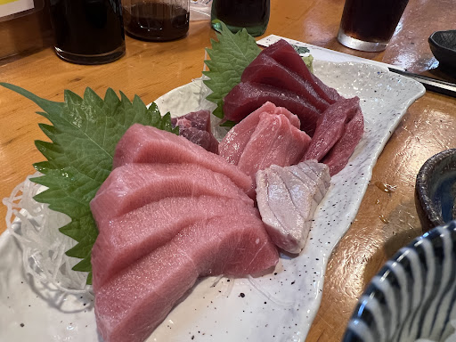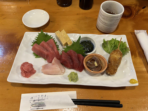 Read more三崎港から一本路地に入ったところにあるこじんまりしたお食事処。鮪のいろんな部位の食べれるお刺身定食いただきました。初めてあごやほおをいただきました。あごは馬刺しのような食感と説明がありましたがお刺身なのに弾力のある歯ごたえで初めての食感に驚きました。串かつもお肉かと思う美味しさ。漬物やお味噌汁も美味しくて満足。つままで美味しくいただきました。後から隣に来られたお客さんが鮪いろいろ定食ではなくお刺身定食を注文され、なんと金目鯛がついていて中トロとキンメ食べれるならそっちも良かったなぁーと…三崎に来たんだからやっぱりマグロだよと言われながらも欲張りなわたしはいろいろ食べたくなってしまう。。次はやっぱり中トロとすきみが好きなのでそれプラス他のお魚も食べれたらいいなぁ。帰り際ご馳走様でした、と店を出る時、大将が「待たせてすいませんでした、またどうぞ」…ヤバッめちゃ気遣いの大将に感動。待たせたお客覚えてて気遣いできるってまた来たくなる人柄ですね。勿論お料理も串かつのあがりに合わせてのお刺身の提供でアツアツのカツや最後までつまにマグロの赤い汁あんまり染みなかったとこも職人の心意気だなぁと思いました。 敢えて言うなら配膳してくれたお姉さん、ご...