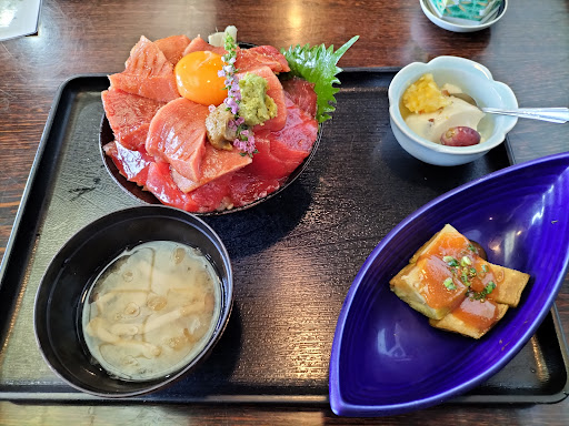 最近は伊豆島で何を食べようかとネットで調べインスタで見かけたマグロをこれでもか!という程のたくさん乗せてる三色丼がどうしても食べたかったのでそちらを注文と、なす田楽と天ぷらもどうしても食べたかったので小さいサイズを付けて貰えないか無理なお願いをし、美味しいマグロの大トロ中トロ赤身、なす田楽と天ぷらという最高の食事が出来ました♡ この幸せな食事には日本酒が飲みたい!私はあまり知識がないので相談した所、オーナー板長様が直々にお勧めを教えて下さり「王祿 渓」をいただいました。辛口のすっきりとした旨さ軽やかさ華やかさ、ここ何年好きな日本酒が増えませんでしたが、久しぶりに美味しい日本酒に出会えました。王祿は温度管理に厳しく取扱い店舗がかなり少ないそうです。