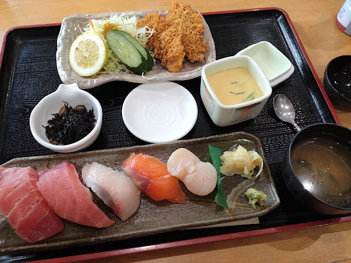 Read moreCランチ(お寿司5貫+アジフライ他) めっちゃお腹いっぱい(〃ω〃) 海鮮丼ランチ・天丼ランチなどA・B・Cランチは1500円で内容はその日によって多少違うらしい。 家族に生物が苦手の人がいて天丼食べてたけど、魚の天ぷらがフワッと美味しそうに揚がっていて羨ましかったが、当の本人は「もっとしっかり揚げてほしいと伝えれば良かった」と言っていた…火がとおってないわけでは無かったので、根本的に魚が苦手なだけの見解と思われる。 子連れでも気兼ねなく賑やかに食事が取れそうな雰囲気で、トイレも車椅子用のトイレが広々としていてマットを持参すれば寝かせておむつ替えも出来そう(ベット無し)※ただし、冬は寒い(;^ω^) トイレといえば、お手拭き用の紙が、よくあるわら半紙みたいな茶色ではなく、白いフワッと感のある紙でした。 ひとつ気になったのは、食事中ずーっと救急車とか消防車とか、緊急車両が近くにいるような音が鳴っていて…窓の隙間でも開いてたのかな?なんの音かさっぱりわからなかったけど、近くで火事だったら食べてる場合じゃないよねって話題作りには役立ちましたが、他の方たちはさほど気にもならない様子ではあったのでウルサイほどではなかったです。けど気になりだすと(汗)